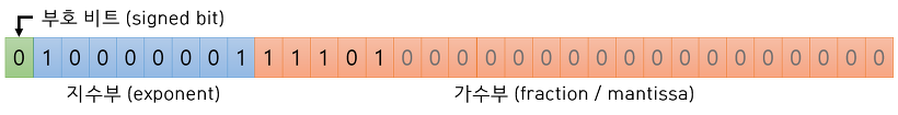 - IEEE754 기준 float형(32Bit)은 [ 부호부 1Bit | 지수부 8Bit | 가수부 23Bit ]