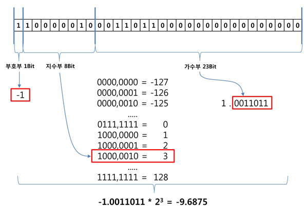 -9.6875 = [ 부호부 = 음수 | 지수부 = 3 | 가수부 = 0011011 ]