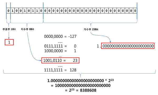 - 따라서, float 형이 표현할 수 있는 최대 값은 8,388,608(10)입니다.