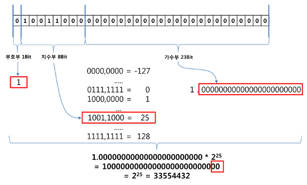 - 위 그림을 살펴보면, 지수부가 25이며 가수부는 모두 0입니다.