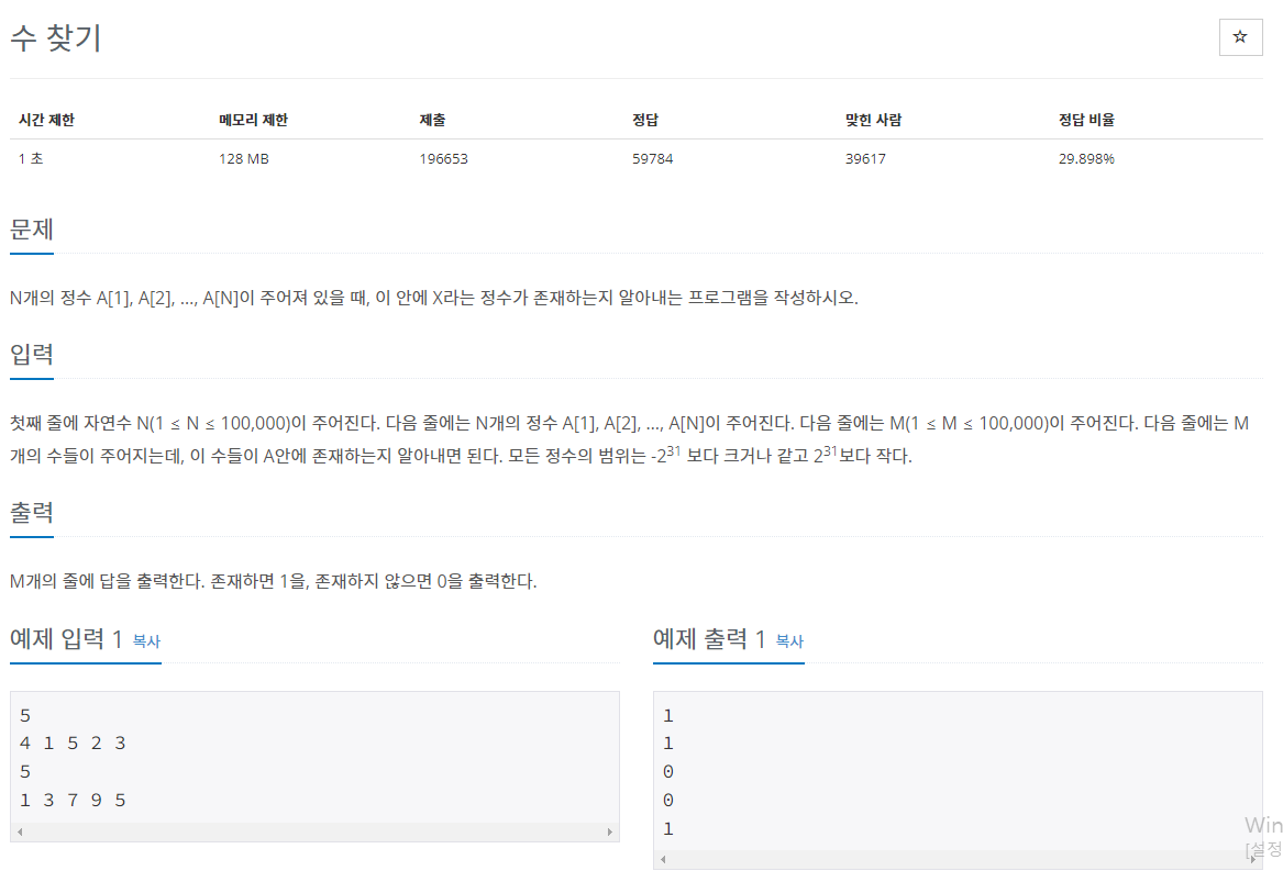 BOJ 알고리즘 1920번(수 찾기) 문제입니다.먼저, 이진 탐색을 활용하기 위해 배열을 정렬하고 있습니다.마지막으로 위에서 살펴본 이진 탐색 알고리즘 코드를 적용하여 쉽게 문제를 풀 수 있습니다!