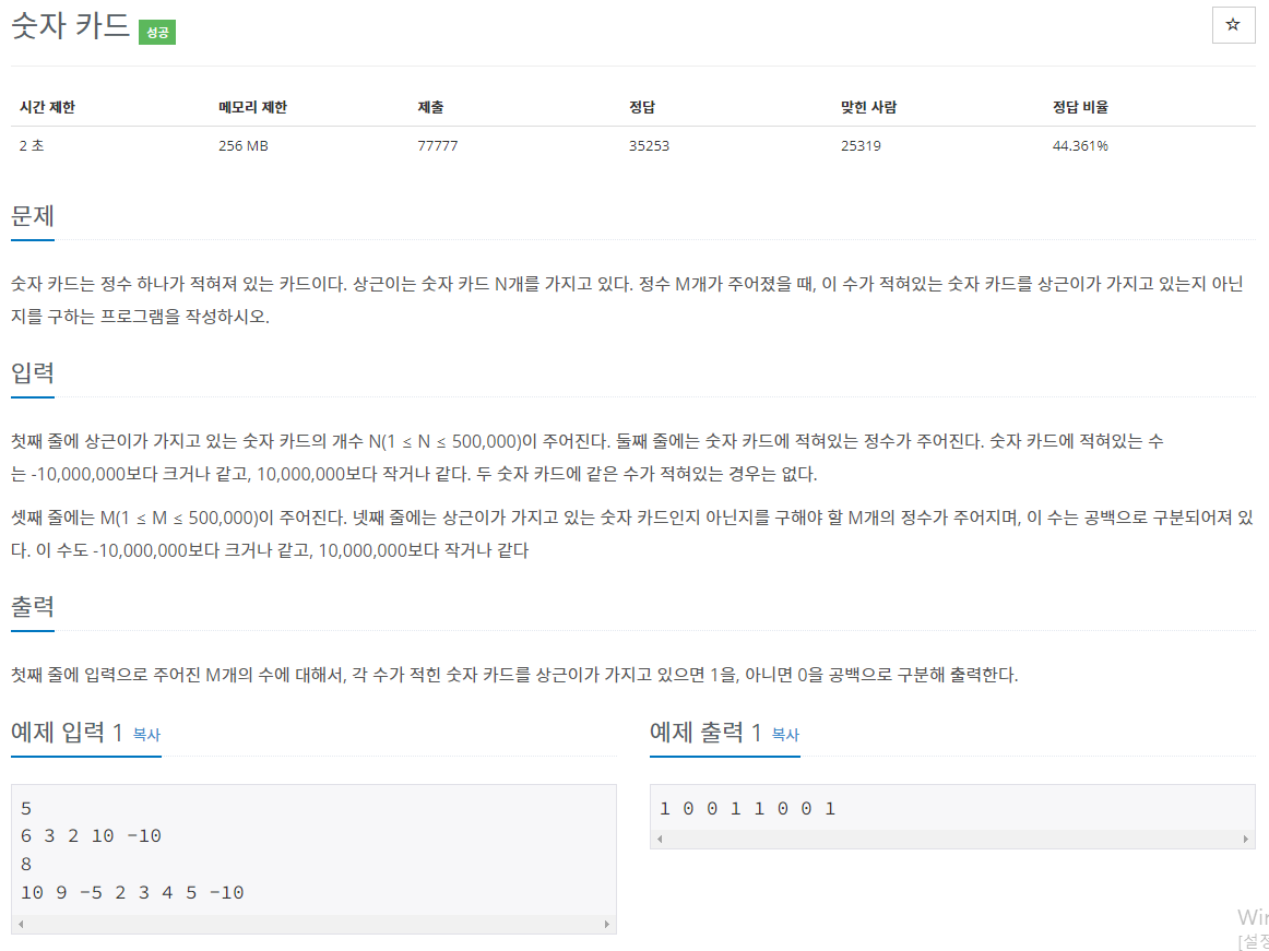 BOJ 문제 중 10815번(숫자 카드) 문제입니다. 가장 먼저, 이진 탐색을 활용하기 위해 배열을 정렬합니다. 그리고, 위에서 살펴본 이진 탐색의 기본 알고리즘을 구현한 코드를 적용해 쉽게 풀 수 있는 문제입니다.