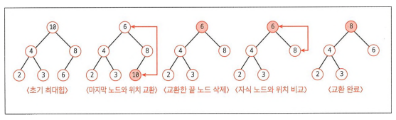 - 변경된 루트 노드를 자식 노드들과 비교하며 올바른 자리를 찾아갑니다.