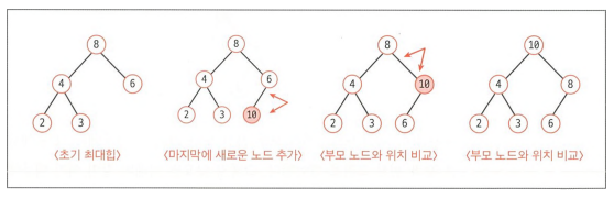 - 최대 힙에 새로운 항목이 삽입되면 일반적으로 해당 노드는 마지막 노드 다음 위치에 추가됩니다.