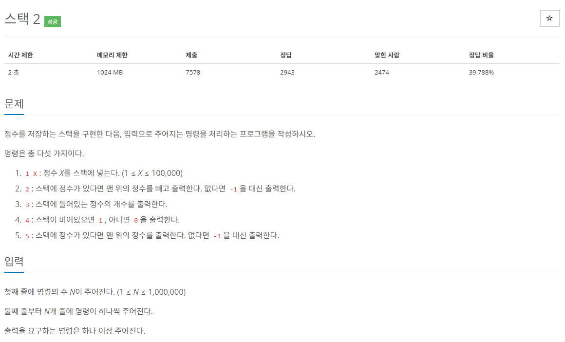 BOJ 알고리즘 문제 풀이, 28278번 스택 2 문제