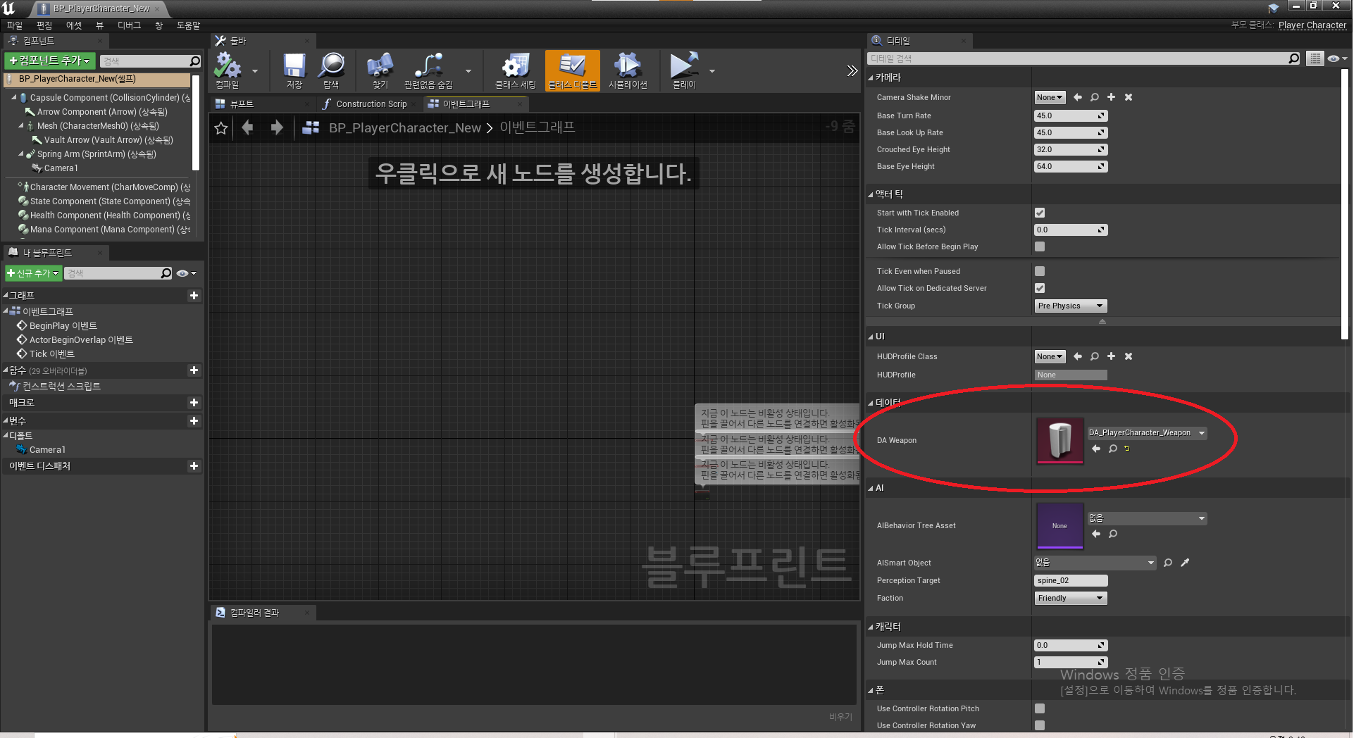 - 게임 내 모든 캐릭터 객체는 GameObject 클래스를 상속하며, 공통적으로 "UDA_Weapon" 형식의 데이터 에셋을 멤버로 선언하고 Editor에. Unreal Editor 상에 캐릭터 객체의 블루프린트에서 Data Asset을 지정할 수 있습니다.