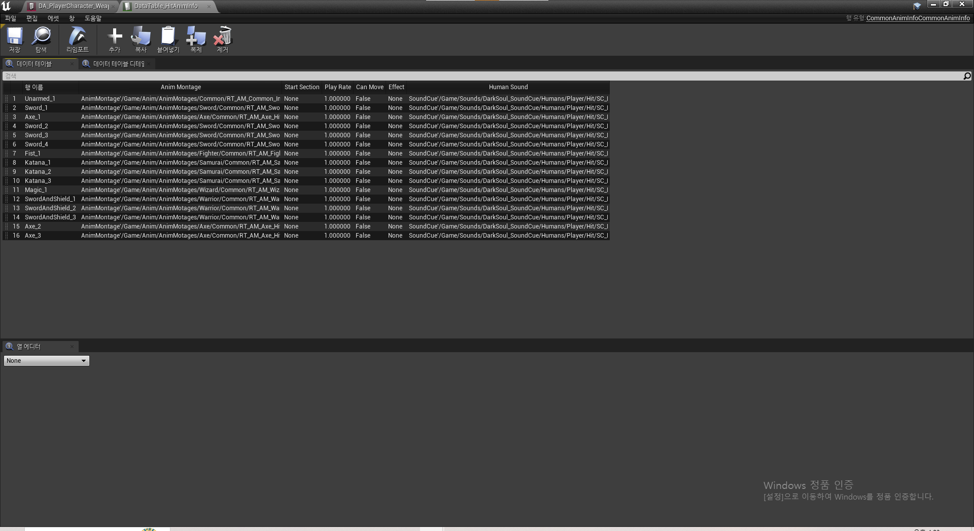 - [FCommonAnimInfo 구조체] : 예를 들면, "Sword_1" 이름의 행은 Sword 무기를 들고 있는 캐릭터 객체가 "피격" 동작을 수행하기 위해 필요한 데이터들을 "FCommonAnimInfo(구조체)" 형식에 담고 있습니다.