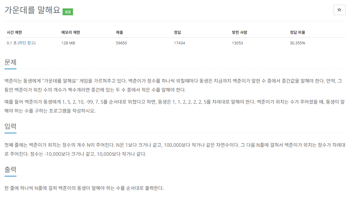 BOJ 알고리즘 문제 풀이, 1655번 문제 "가운데를 말해요"