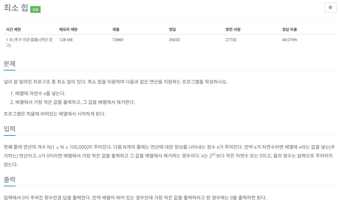 BOJ 알고리즘 문제 풀이, 1927번 문제 "최소 힙"