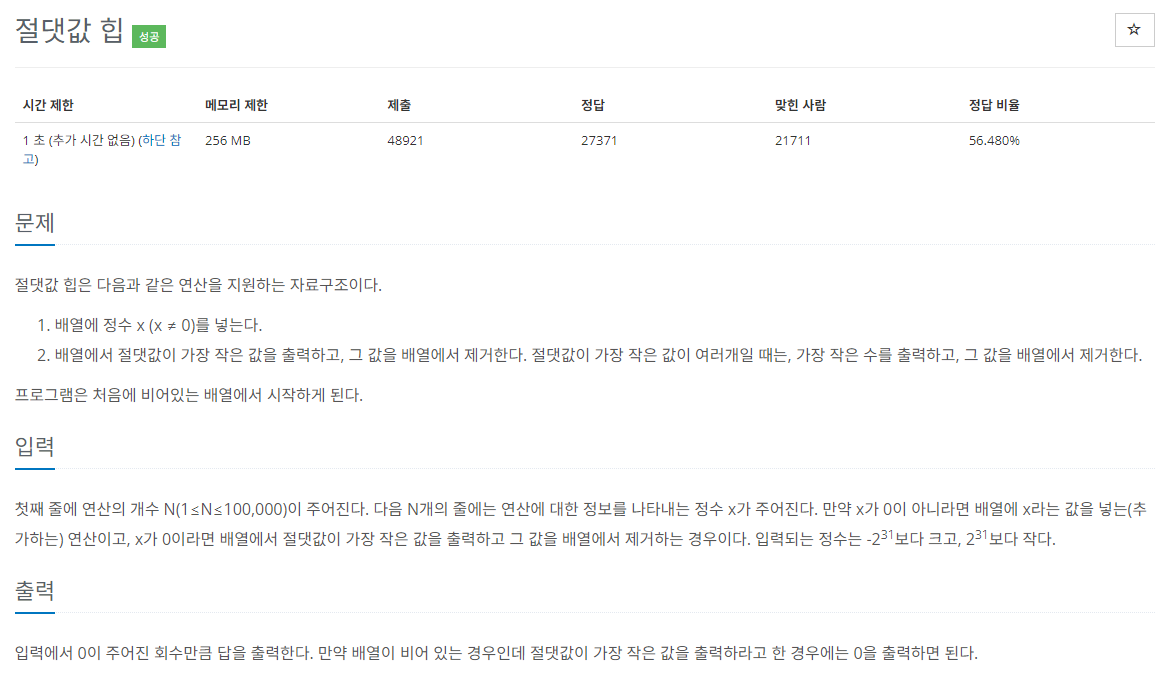 BOJ 알고리즘 문제 풀이, 11286번 문제 "절댓값 힙"