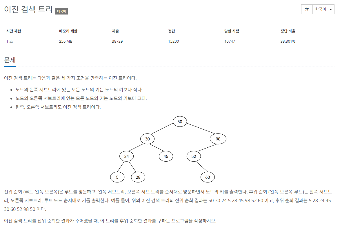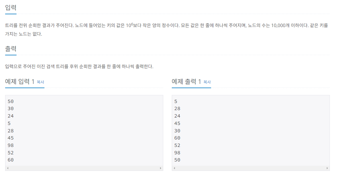 BOJ 알고리즘 문제 풀이, 5639번 문제 "이진 검색 트리"