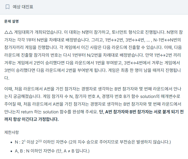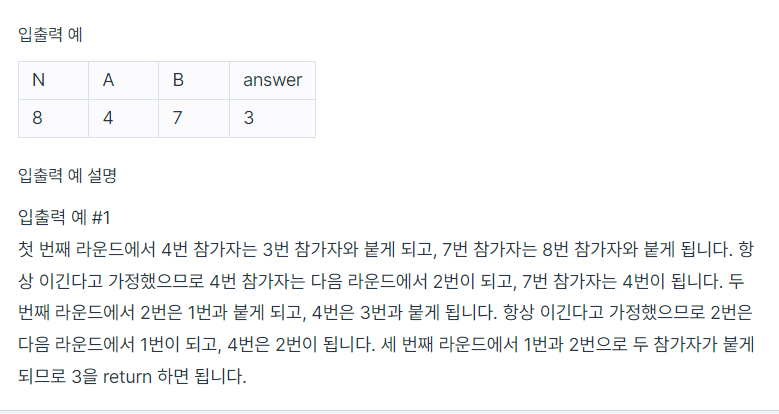 - a와 b는 매번 이기며 토너먼트를 올라가며, 새로운 라운드에 가서 (a+1)/2 혹은 (b+1)/2 번호를 부여받기 때문입니다.
