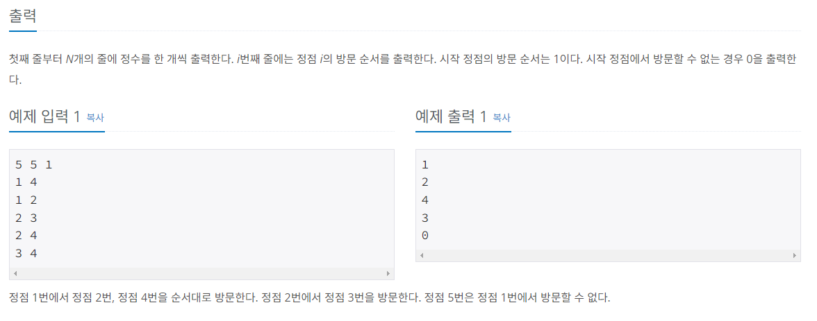 - 입력받은 간선 정보를 2차원 벡터에 저장하고, 각 항목에 저장된 vector 컨테이너를 오름차순 정렬합니다.