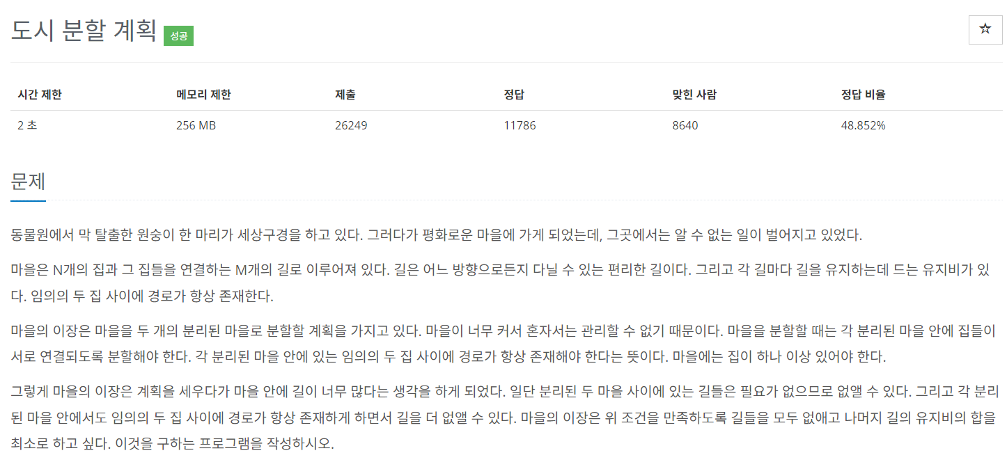 - 먼저, 문제는 분리된 두 마을 모두 임의의 두 집 사이에 경로가 항상 존재함과 동시에 필요 없는 나머지 길들은 제거 하면서도 두 개의 마을로 분할하고자 한다. 즉, 주어진 그래프로부터 '최소 신장 트리(모든 정점을 연결함과 동시에 최소한의 간선으로 구성된 부분 그래프)'를 구성하고, 남아있는 길들의 유지비를 최소로 하기 위해 최소 신장 트리를 구성하는 간선들 중 가중치가 가장 높은 간선을 제거함으로써 두 개의 최소 신장 트리로 분할해야 합니다.