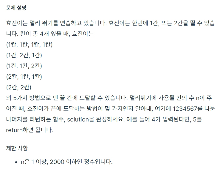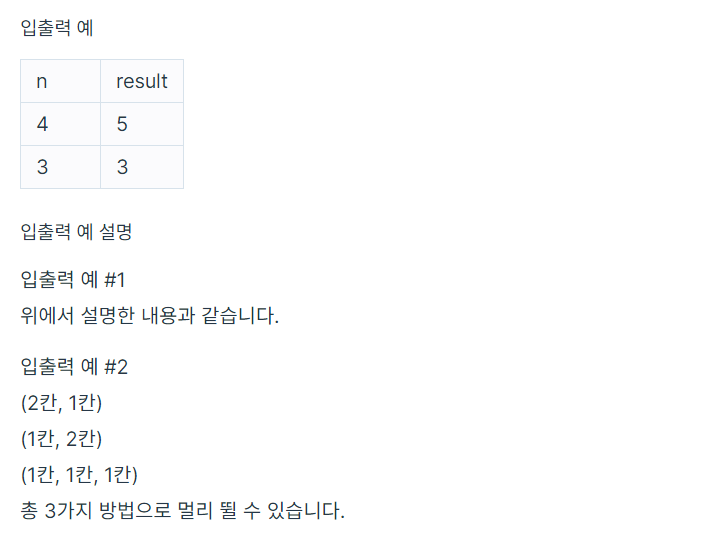 - Memoization을 통해 이전 단계의 경우의 수를 기억하며 동적 계획법을 구현합니다, DP[i] = DP[i-1] + DP[i-2]