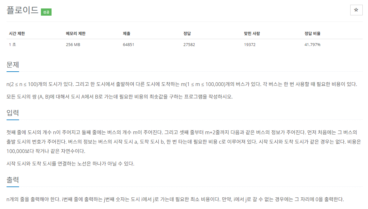 // 여러 노선 존재 가능, 최소 비용을 갖는 노선으로 갱신