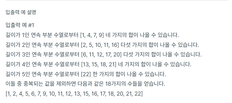 - 두 포인터가 가리키는 위치 사이에 존재하는 항목들의 누적 합을 계산하여 set 컨테이너에 삽입하고, 시작 위치를 가리키던 포인터와 부분 배열의 마지막 위치를 가리키던 포인터를 1씩 증가시키며 시작 위치를 가리키던 포인터가 배열의 끝 위치에 도달할 때까지 알고리즘을 수행합니다.