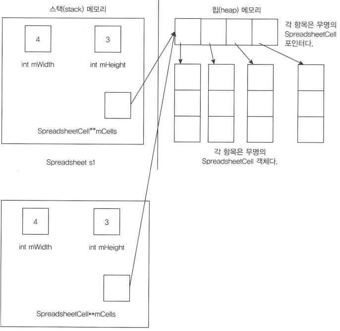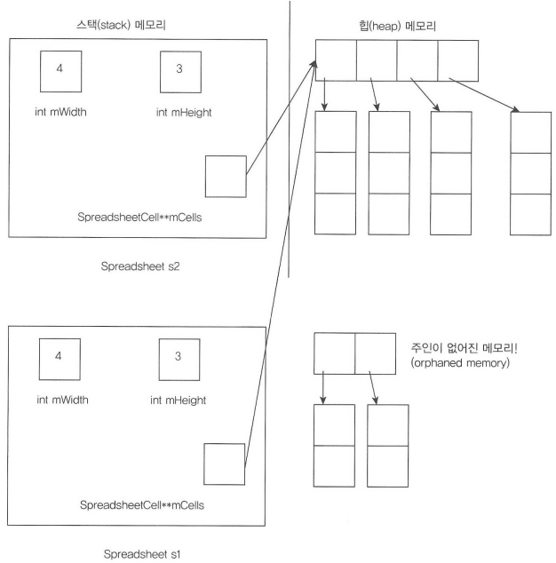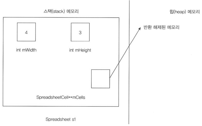 따라서, printSpreadsheet 함수의 종료 시점에 "s"객체가 소멸되면, 해당 객체가 가리키고 있던 메모리가 반환되어 "s1" 객체가 이미 반환되어 빈 메모리를 가리키고 있는 현상이 발생할 수 있습니다.