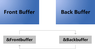 에니메이션 구현 중 프레임과 프레임 사이에 끊김 현상을 방지하기위해, 이중 버퍼링(Double Buffering)을 사용합니다. 먼저, 한 프레임 전체를 화면 바깥의 텍스처, 즉 후면 버퍼에 그립니다. 그리고, 후면 버퍼에 저장된 하나의 프레임을 화면에 제시함으로써, 사용자에게 오직 완성된 프레임만 보여주어, 끊김 현상을 방지할 수 있습니다. 이때, 우리는 2개의 텍스처가 필요합니다. 전면 버퍼(화면에 제시되는 이미지 자료가 있는 텍스처) 그리고 화면 바깥의 후면 버퍼. 이렇게 2개의 텍스처를 사용하는 방법을 "이중 버퍼링"이라고 부릅니다. 추가적으로, 전면 버퍼와 후면버퍼는 하나의 교환 사슬(Swap Chain)을 형성하여, 각각의 포인터들을 맞바꾸어, 화면 제시 연산이 진행됩니다. 교환 사슬을 대표하는 인터페이스는 "IDXGISwapChain"으로 전면 버퍼 텍스처와 후면 버퍼 텍스처를 담고 있고, IDXGISwapChain::ResizeBuffers(버퍼 크기 변경) 메소드와 IDXGISwapChain::Present(화면 제시) 메소드를 제공합니다.