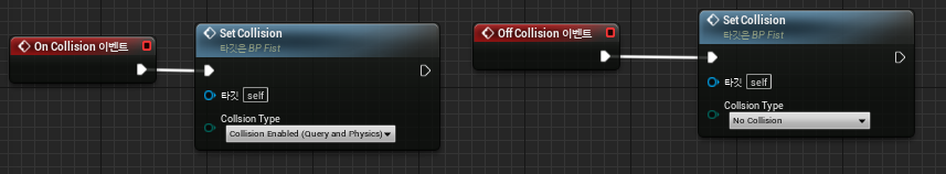간단하게 BP_Fist에서 선언한 SetCollision 함수를 호출하고, Collision 타입을 전달합니다.