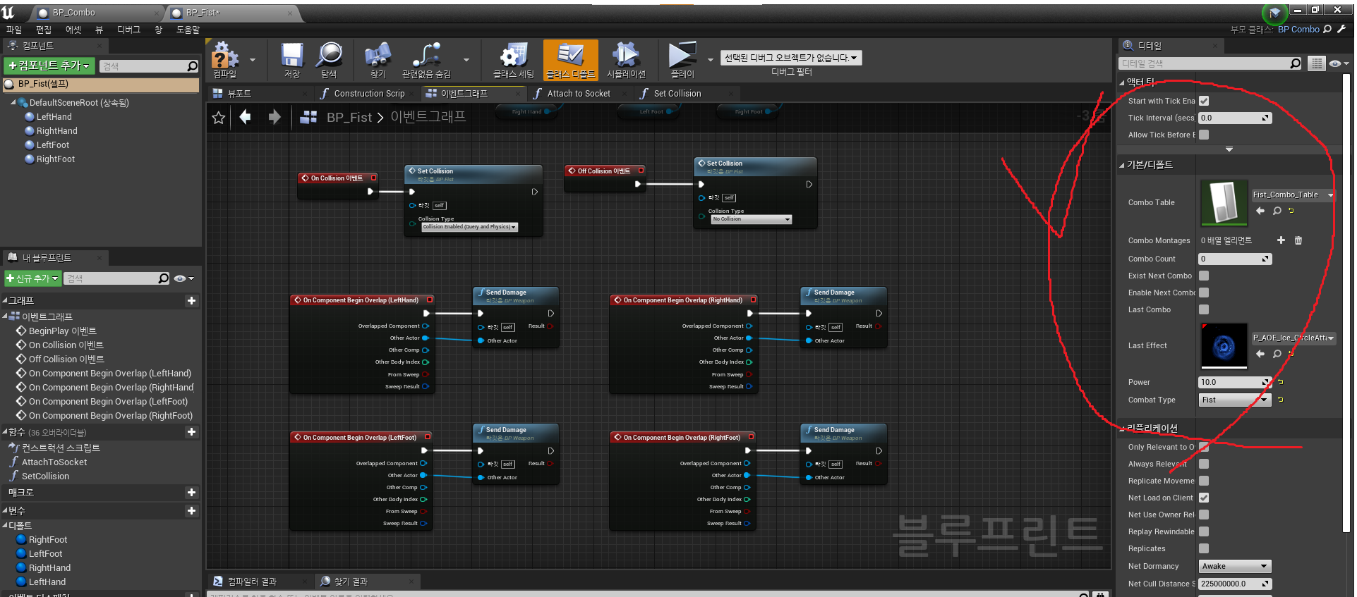BP_Combo에서 선언하고 BP_Fist에서 상세 구현한 OnCollision + OffCollision 커스텀 이벤트