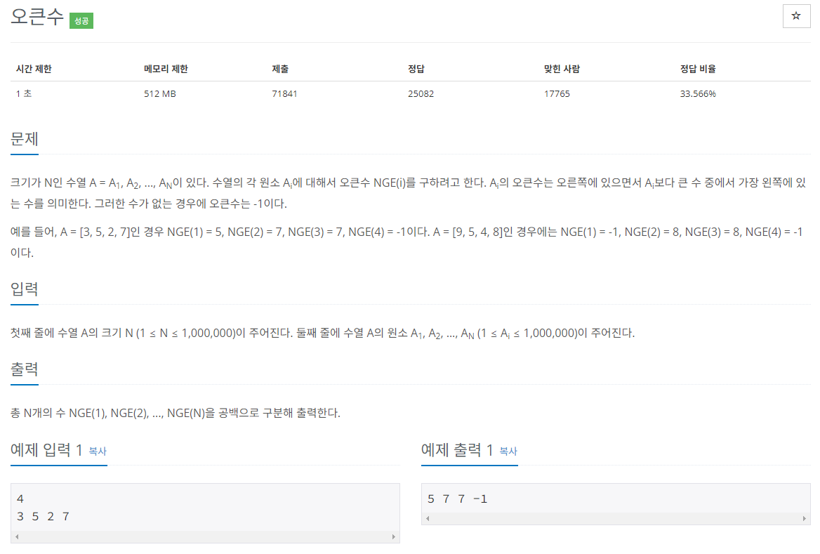 BOJ 알고리즘 문제 풀이, 17298번 문제 "오 큰 수"
