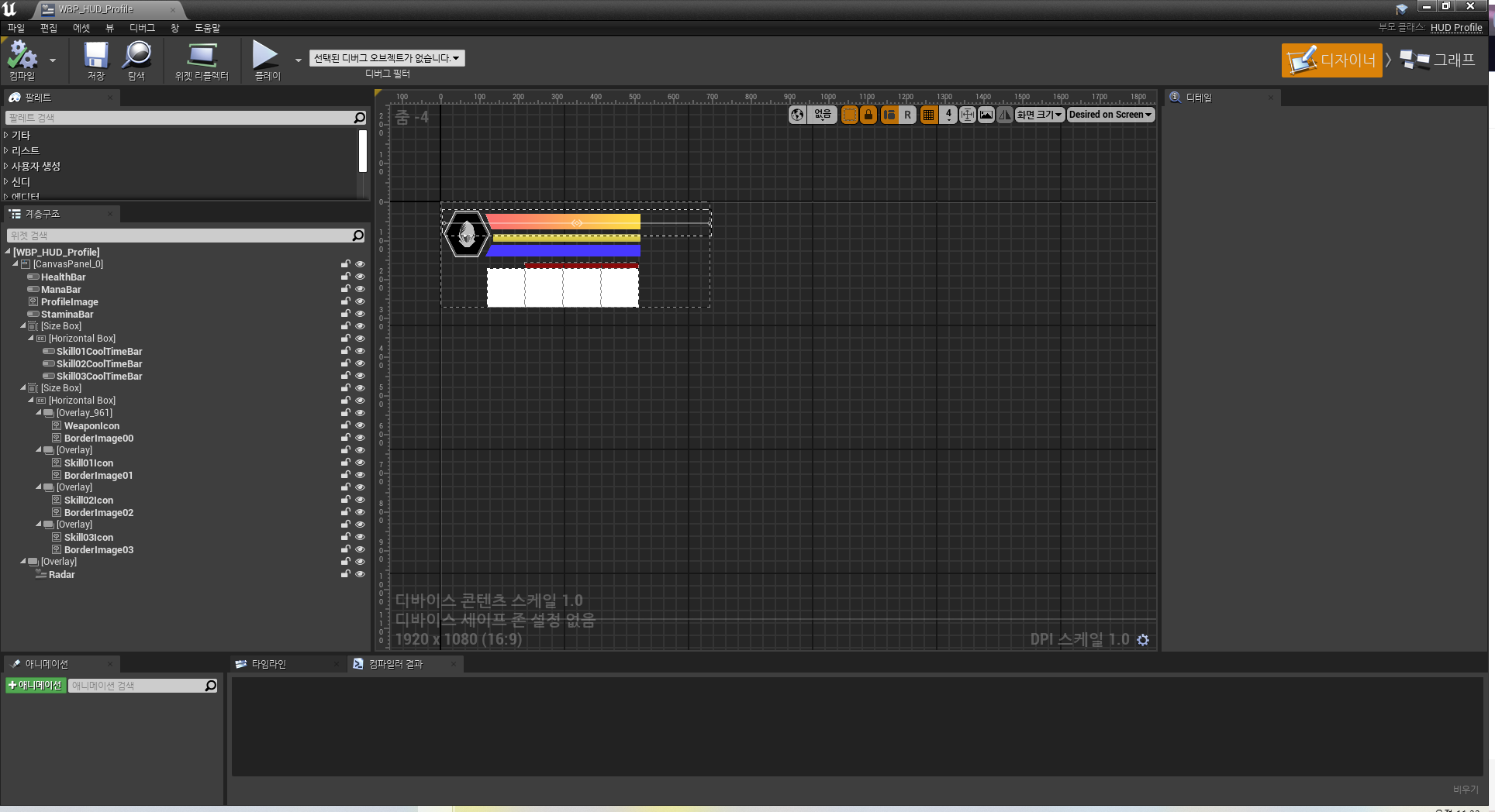 - UHUD_Profile은 크게 두 가지 하위 위젯을 가지며, UProgressBar(게이지) 형식의 진행 상태 바 위젯과 UImage(이미지) 혹은 UTexture2 D 형식의 이미지 위젯이 있습니다.